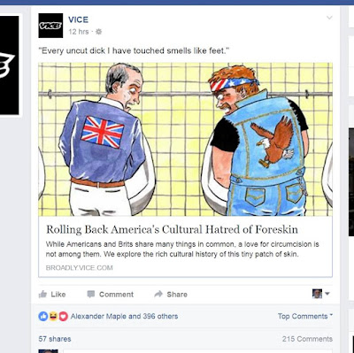 But while they posted it on Facebook with the following inflammatory headline, "Every uncut dick I have touched smells like feet," the post can't be seen by anyone outside of the United States.